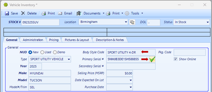 RESULT: A green checkmark will display in the yellow box and the Body Style Code will automatically display.